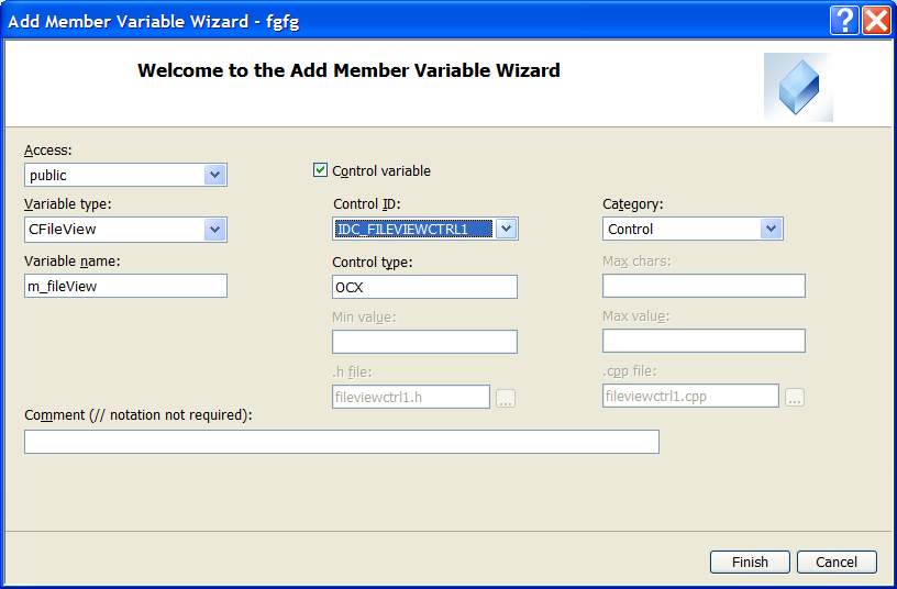 Copy all the wrapper files to your project folder and add them to your project using Project-->Add Existing Item. To add a new member variable corresponding to a control on the dialog box, right-click on the control on the dialog editor and selecting the 'Add Variable...' menu item. Specify the wrapper class name in the 'Variable Type' field (for example, for FileView, specify CFileView which is defined in the fileview.cpp and fileview.h wrapper files). Also make sure that the 'Control Variable' checkbox is checked. The image below demonstrates this. Notice that the '.h file' and '.cpp file' fields are automatically grayed because you specified a class name (CFileView) which already exists in the project.